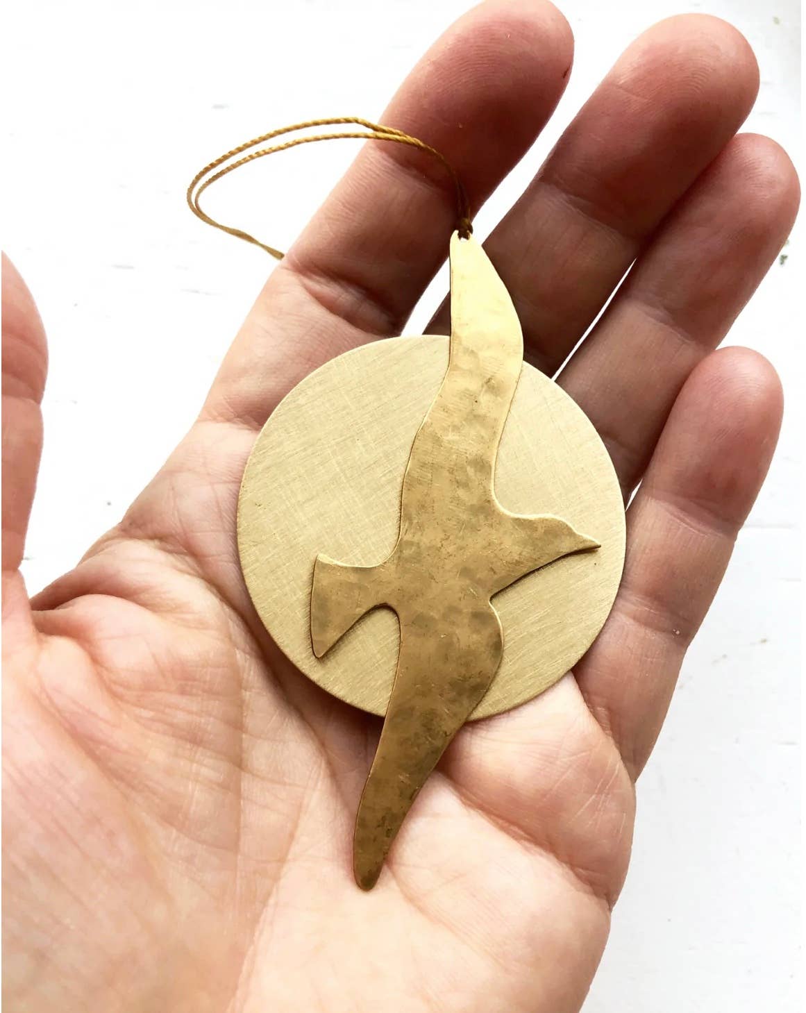 Artisan-crafted story ornament made from hand-cut and hammered brass sheet.